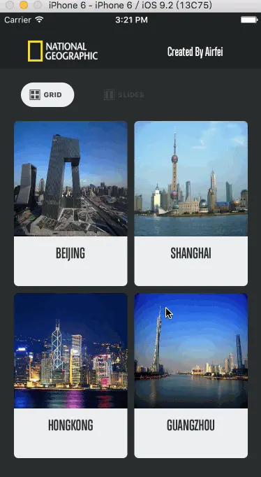 ZFCityGuides 使用方法: 打开.xcworkspace编译运行即可 高仿City Guides 动画效果 详细参见简书: 干货系列之实现City Guides的动画效果(一) 干货系列之实现City Guides的动画效果(二) 此demo仅供学习交流使用。 部分动画效果: 动画效果1: 动画效果2: 动画效果3: 动画效果4: 动画效果5: 动画效果6: