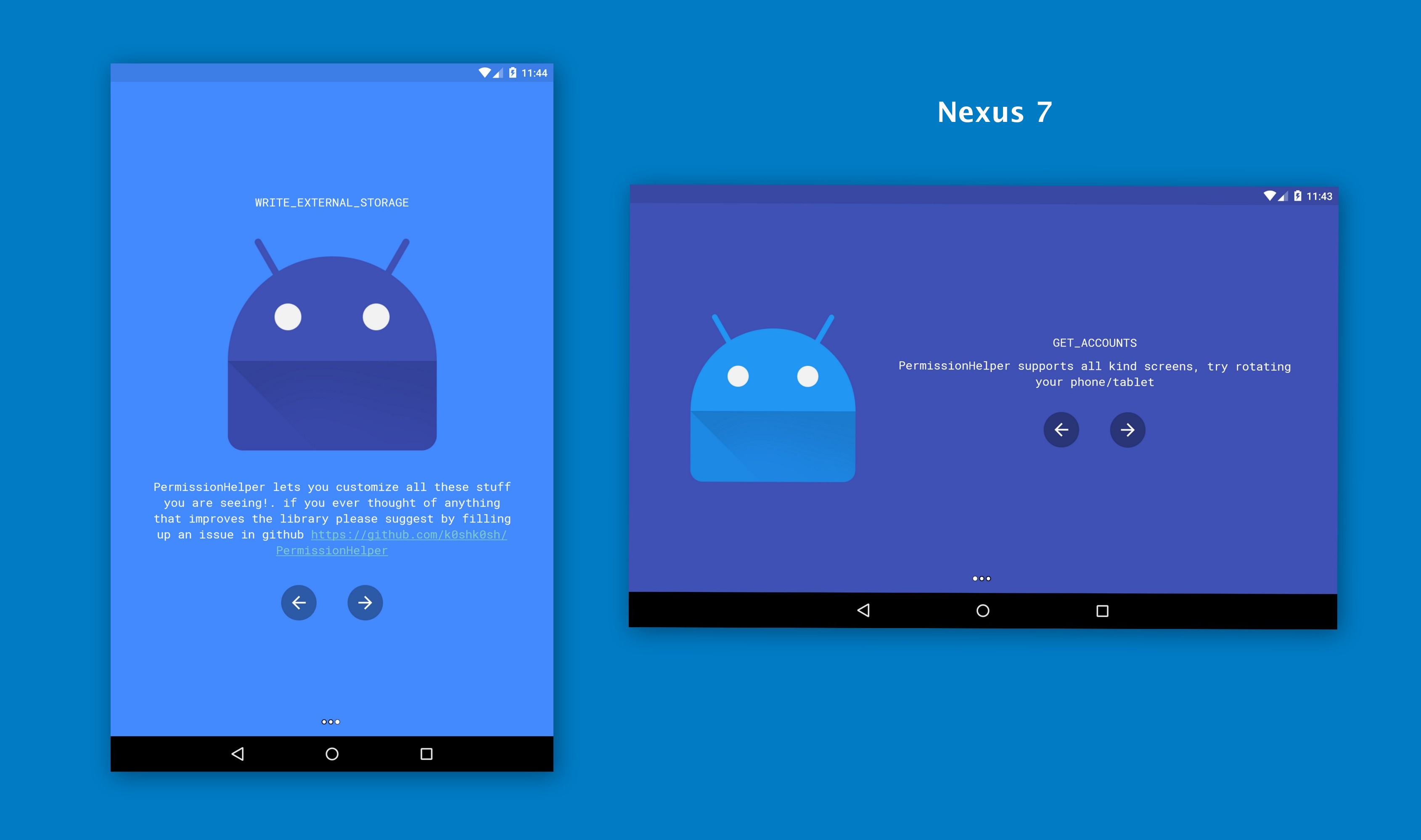 Dialogis showed.(follow example code below to know how). BasePermissionActivitysupport Portrait & Landscape modes for both Mobile Phones & Tablets (as showing in above images).SYSTEM_ALERT_WINDOW Permissionis being automatically handled if you ever pass it along other permissions ;) .