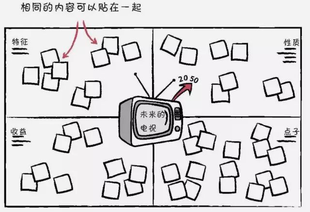 例如说讨论未来的电视。「特征」包括可录性媒体等;「性质」可以是描述性的语言,如获取资讯等;「收益」是科技和产业价值;「点子」可以事先准备,也可以现场补充,随时记录。