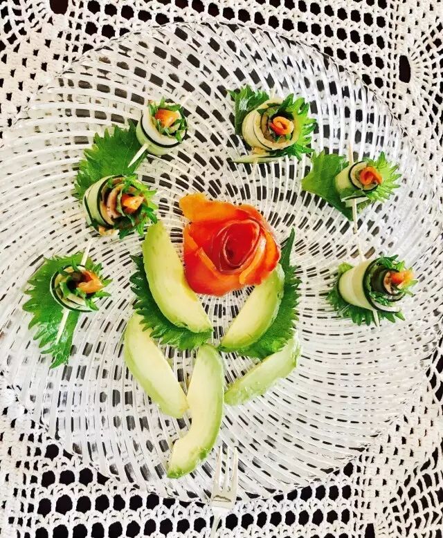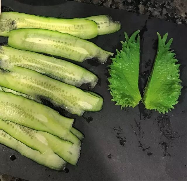 黄瓜用刨皮器刨成下图的样子,汉姆先用开水烫软,再放冷水浸泡到常温。先铺一到两条黄瓜片,上面铺一层汉姆,再放上两片紫苏叶(可以用绿叶蔬菜代替)卷起来用牙签固定,中间用红色的三文鱼点缀。花儿一样的手工汉姆黄瓜卷就做好啦。