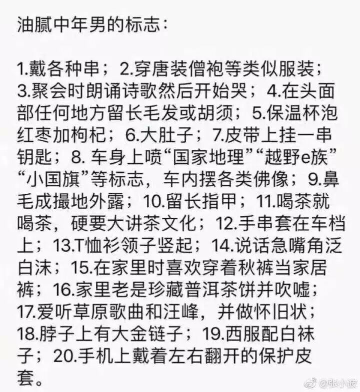 起因是因为冯唐老师发了一篇《如何避免成为一个油腻的中年猥琐男》,瞬间引爆了朋友圈和微博。开始纷纷有人对号入座,检讨自己的油腻指数;也有人批判反击,觉得这些并不是检验一个中年油腻男的标准。众说纷纭,好不热闹。