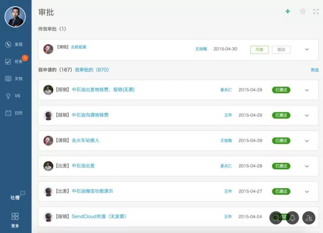 审批是一件不想办,但又不得不办的事情。据统计企明岛目前没有驳回的审批,无论是报销、请假、还是出差,都如此。为什么?因为做为一支年轻的团队,大家是基于充分的信任在工作。审批只是为了让工作更有效的协调方式。于是,企明岛采用了开放的信任审批机制,每位成员在提交审批的时候可以自由的选择审批责任人。