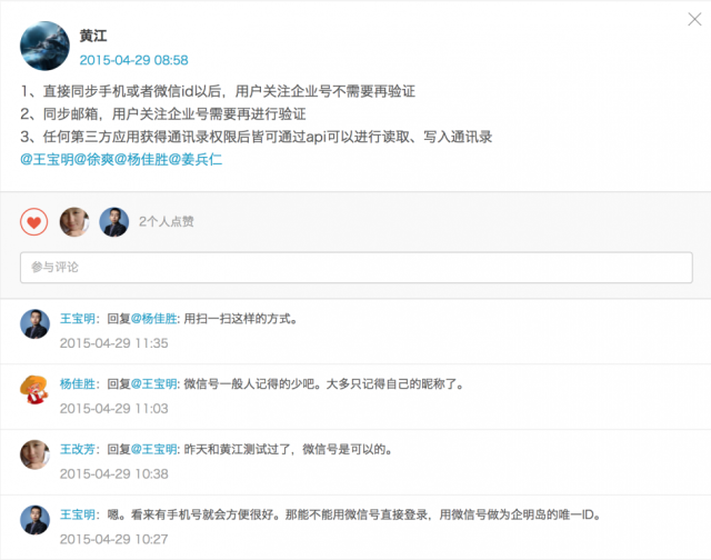 用开放的心态迎接变化,保持顺畅的沟通。沟通让工作更加的协调、高效。企明岛团队的及时沟通也是通过QQ与微信解决,但对于类邮件的沟通,基本上通过企明岛内置的微博功能,把有价值的沟通内容有序的记录,譬如通过##进行主题的知识管理,通过@ 通知相关责任人。现在除了对客户的邮件,内部已经完全的去邮件化了。