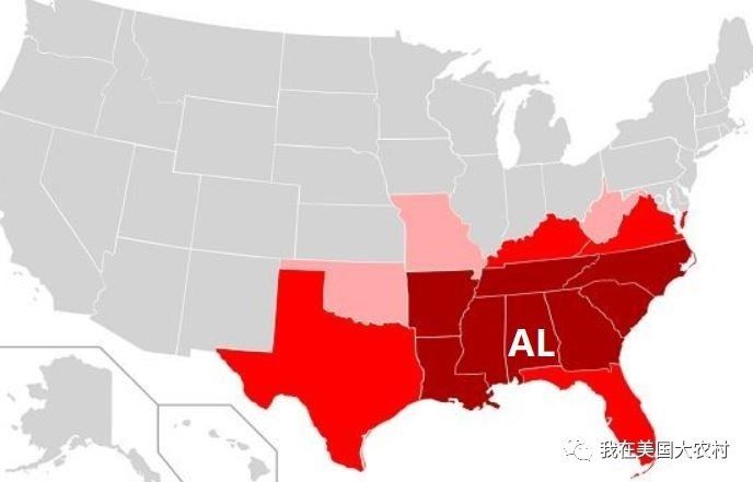 阿拉巴马州车牌的右下角有一个小小的心形,里面写着“Heart of Dixie”。阿拉巴马州最初的时候被大家称为棉花州,可是出产棉花的州有很多,为了与他们区别开来,阿拉巴马州的商会提出了这句标语,并在1955年首次用在车牌上。此后这句标语也一直以各种形式在阿拉巴马的车牌中出现。标语中的Dixie泛指美国的南部,我从维基百科中找到了下面这张图,其中深红色的部分就是Dixie最初指代的美国南部,红色和粉红部分分别是现代指代的美国南部和与美国南部相关的几个州。从图中可以一看出,阿拉巴马州确实一直是Dixie的最中心。