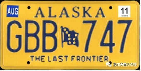阿拉斯加州车牌的最大特点是经久不变的黄底色,北斗星的州旗加标语“The Last Frontier”。这句标语与阿拉斯加州独特的地理位置有关。这个州位于美国的最西北角,与美国本土分离,而与加拿大接壤。前几年,探索频道曾经在阿拉斯加拍摄过一个很火的真人秀节目,考验雪地生存技能,节目的名字也用的是The Last Frontier。