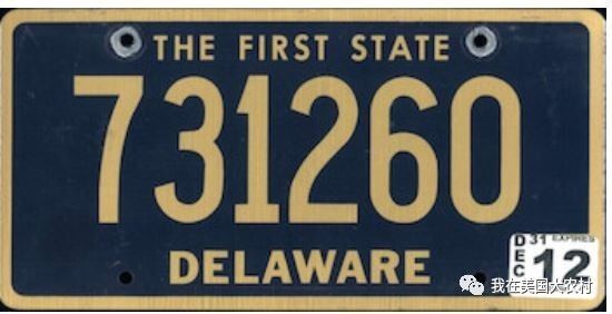 特拉华州的车牌上的标语是“The First State”。“第一州”这个称呼来自于特拉华州是第一个复决通过目前美国宪法,并加入现今美国联邦体系的州。特拉华车牌的设计除了标语也全无特色,曾在一家汽车保险的网站上被评为最差设计。我个人觉得这个设计还可以,至少以纯黑色做底色,金色的字体,非常大气。(论特色,以黑色为底也算是特色,这是五十州里唯一一个黑色底的车牌。)