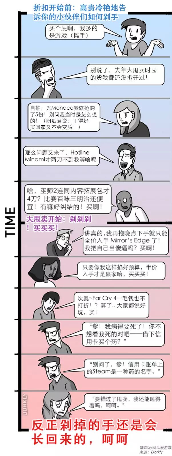 一年一度的暑假Steam游戏大甩卖刚刚结束!平时不舍得买的游戏在甩卖中都有大优惠,一浪一浪的吐槽声中,玩家们心思都活络了。看歪果仁是如何在这场没有硝烟的抢购大战中保持优雅的姿态的?闷瓜君希望对你们下次在京东六一八、双十一抢购活动中有参考价值。请叫我雷锋!(翻译:闷瓜爱游戏,来源:Dorkly)