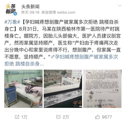 昨天,网络曝出陕西榆林第一医院于8月31日发生一起待产孕妇跳楼案