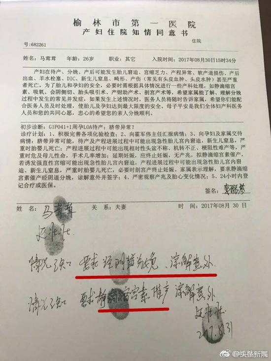 从医院方发出的住院知情同意书上显示,产妇丈夫在同意书上大大的签写着要求顺产,要求宫缩素催产,谅解意外