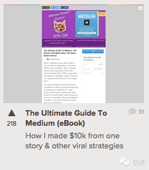 在那之后的一天,另一个电子书项目(关于Medium行销)也出现在Product Hunt上。 引人注目的是网站缩略图上显眼的Product Hunt招牌猫图,以及PH成员享受65折的宣传。