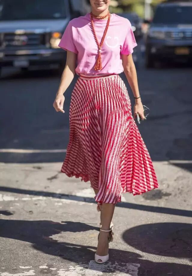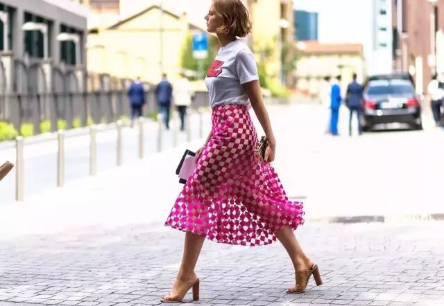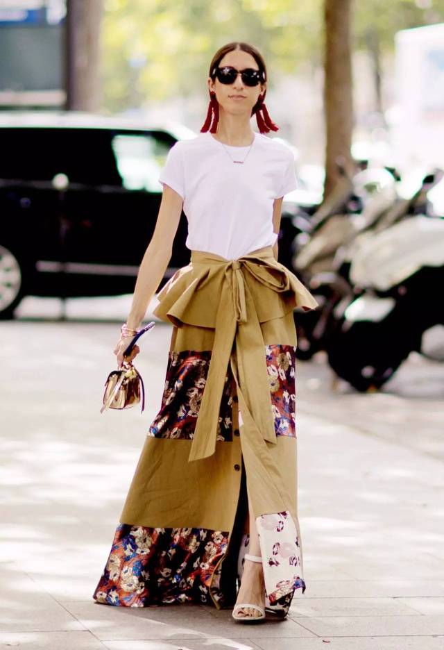 对于大片印花的半身长裙,很多人都是望而却步。这种裙子其实并不难驾驭,只要搭配一件素色上衣,就基本不会出错啦。