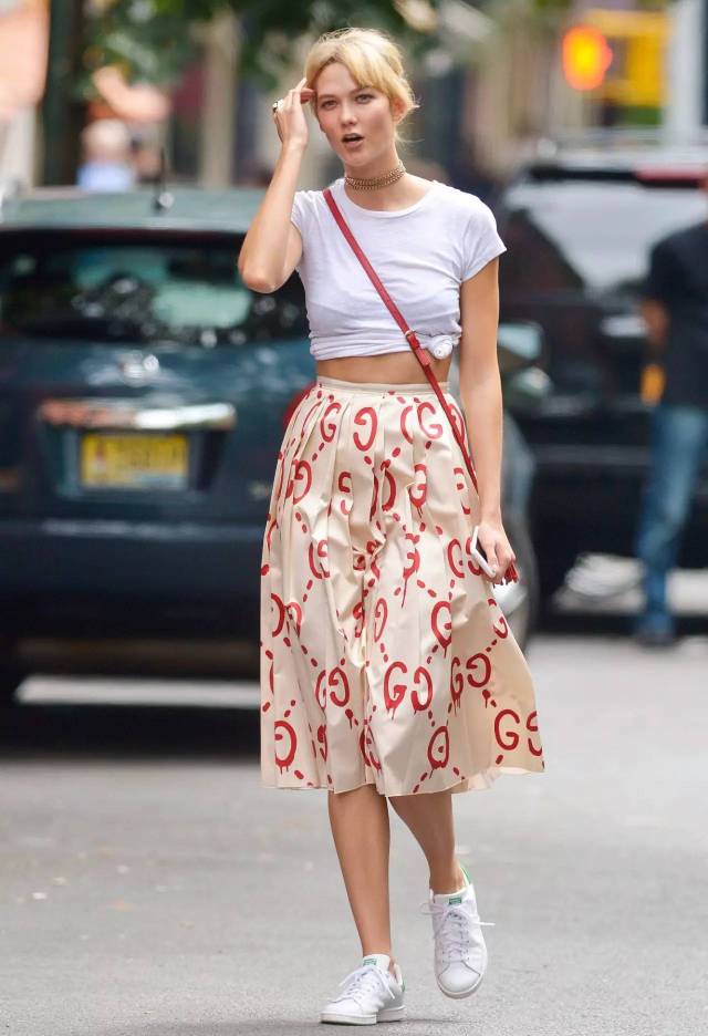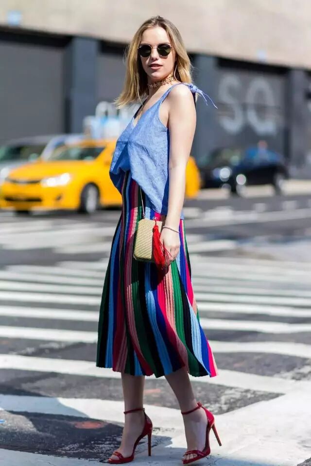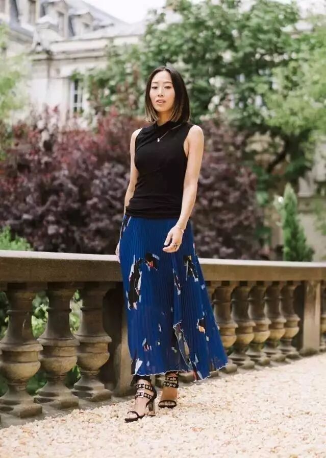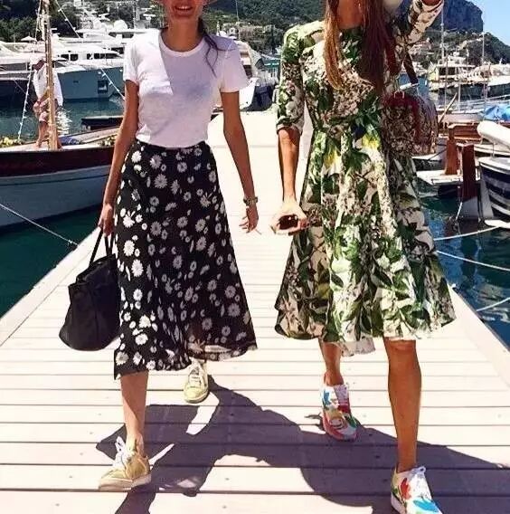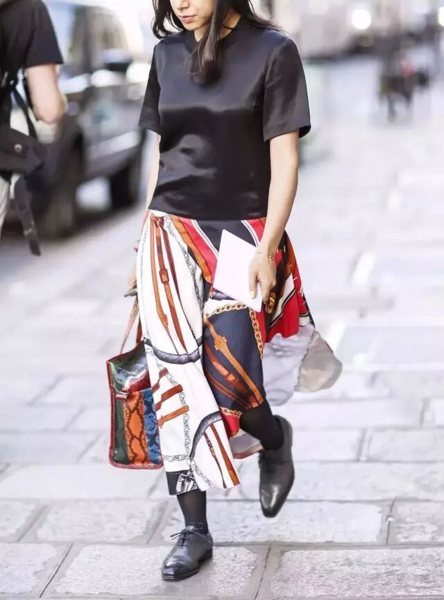 高跟凉鞋,平底鞋都是印花长裙的好伙伴。秋天快来了,在小皮鞋里面穿一双长袜也是不错的选择。