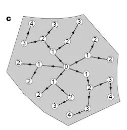 我们把这个网络设想成一个输运资源流的网络。在图中,节点0是提供给所有节点的资源流的源。每个节点可以跟它的有限个邻居节点相连,并且对于任意一个节点都必须保证有一条从源到它的路径。通过给这个网络加入一些合理的限制,同时运用数学推理,Banavar证明了,网络的拓扑结构可以决定资源运输的效率,而资源效率最高的结构应该是如下图c所示的网络,效率最低的网络是d所示的结构。具体推理过程,请参看这里。