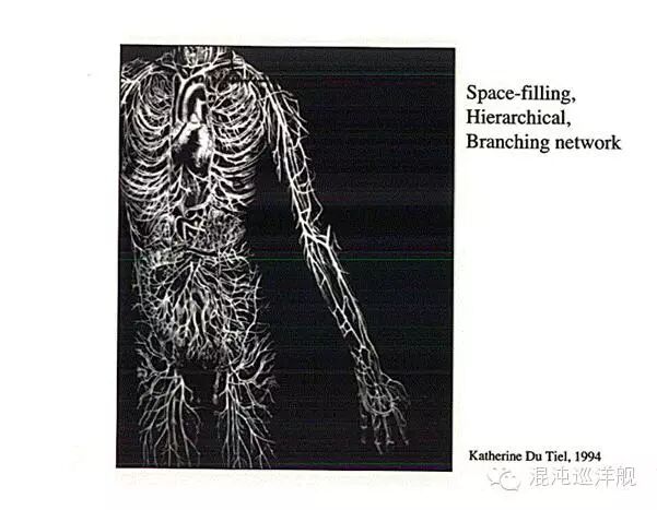 我们看到,生物体的面积与长度不再呈平方的关系而是三次方,同样体积不再是三次方而是四次方,分形结构使得生物体能够在更高的一个维度空间中发展,所以Geoffrey那篇文章题目就叫“生命的第四维”。分形的几何形状在Geoffrey的解释中仍然起到了关键的作用。