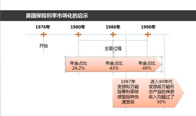 在1980年的时候美国保险市场上年金的占比24.2%,到1986年43%,到1990年49%。其实是从1987年这种浮动的、变额的、分红的、万能的利率敏感型的这种保险才逐渐出现成为主流。到了90年代后期的时候就已经超过半壁江山了。