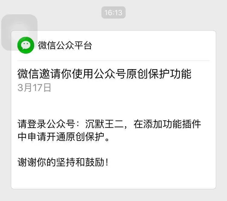 昨天,对,就在昨天,我的公众号沉默王二收到了微信的原创保护邀请。
