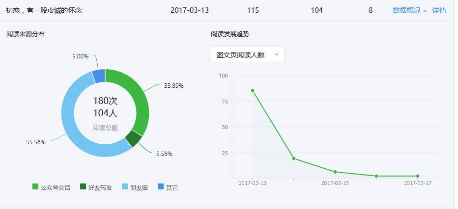 初恋,有一股虔诚的怀念 这篇文章阅读量为104次。可以看得出朋友圈占比为55%,而公众号推送只占了33%!