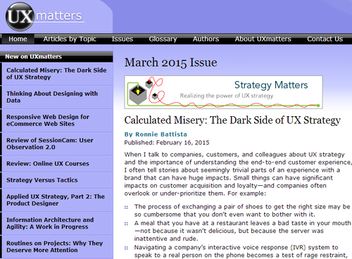 UXmatters为所有从事UX方面的专业人员提供独特的见解和灵感,网站上的作者包括许多在用户体验方面领先的专家,帮助专业开发人员学习最佳的实践经验和了解UX未来的发展方向。