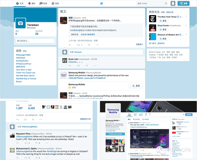 整体蓝色设计带来统一印象,颜色的深浅分别承载不同类型的内容信息,比如信息内容模块,白色底代表用户内容,浅蓝色底代表回复内容,更深一点的蓝色底代表可回复操作,颜色主导着信息层次,也保持了twitter的品牌形象。