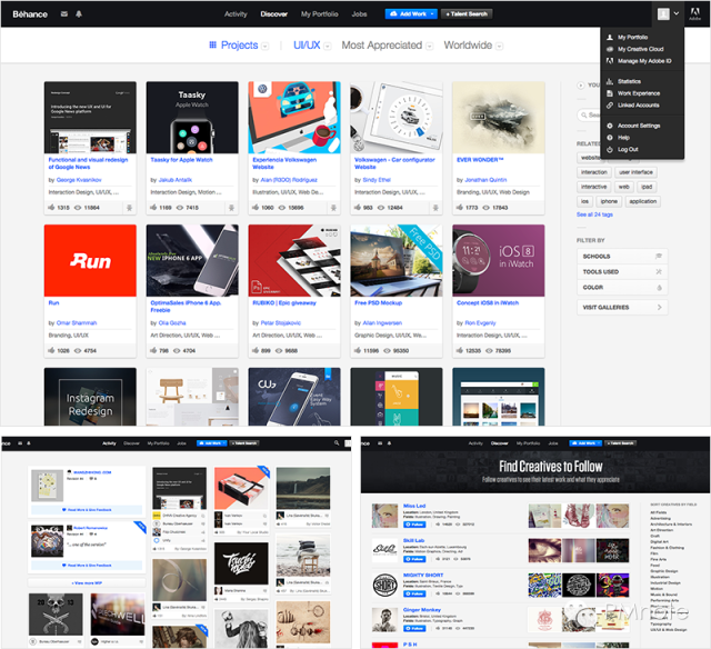 在实际的设计运用中,常会用些更综合的手法,例如整体有主导色调,小范围布局会采用同色调搭配。拿tumblr的发布模块来说,虽然页面有自己的主色调,但小模块使用同色调不同色彩的功能按钮,结合色相变化和图形表达不同的功能点,众多的按钮放在一起,由于同色调原因模块非常稳定统一。