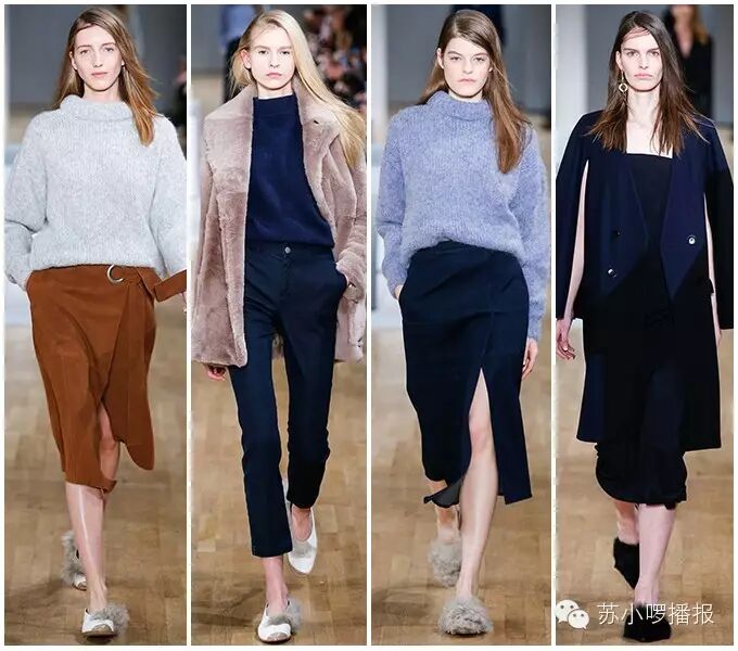 虽然热度不及Gucci,但是感觉Tibi的适用范围更广,秀场搭配也很亲切,温暖大毛衣+剪一刀半裙,毛毛外套+九分裤。这基本上都是现有不需要在购置的单品,加一双毛毛鞋,立马就有了“新款味”。