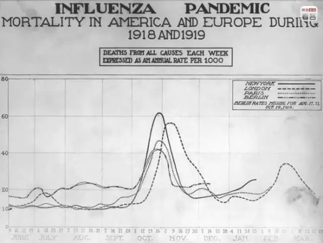 西班牙流感的全球平均致死率约为2.5%-5%(一般流感约0.1%),全世界约10亿人感染,2千5百万到4千万人死亡(当时世界人口约17亿人)。图为1918年-1919年,美国以及欧洲流感死亡率图表。1918年10月,死亡率达到峰值。