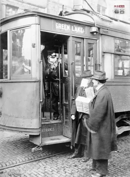 还有一些布告上写着:“吐痰等于死亡”。在费城,曾经一天之内就有60人因在街上吐痰而遭逮捕。图为1918年,美国西雅图,公共汽车列车员禁止未带口罩的乘客上车。