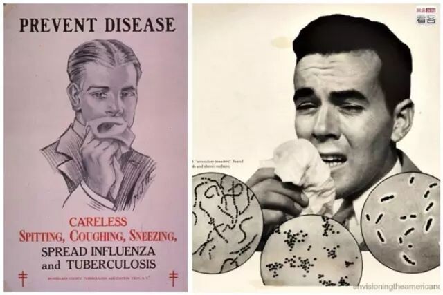 图为当时媒体和大街上常见的广告。上边写着“小心不要咳嗽、打喷嚏,这会传染流感及结核病”。