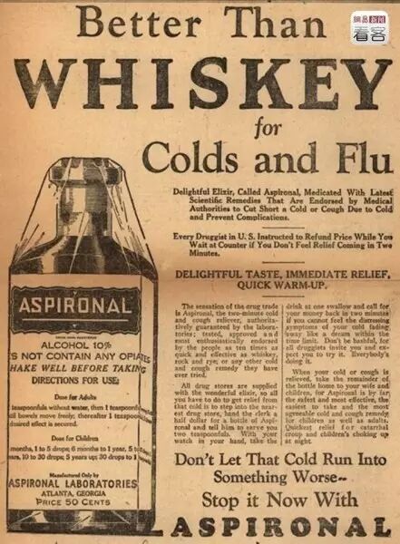 最受欢迎也最无实效的药方之一,是威士忌:“喝醉了发发汗也能退热。”图为一则声称对付流感“比威士忌更好”的产品广告。